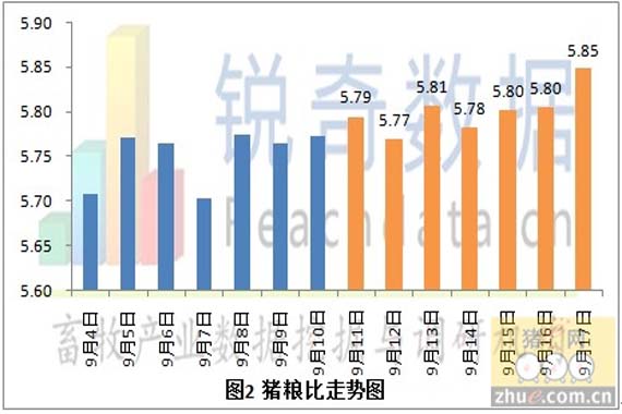 據(jù)銳奇數(shù)據(jù)監(jiān)測(cè)的當(dāng)?shù)厣i報(bào)價(jià)信息統(tǒng)計(jì),2012年9月18日全國(guó)各省生豬平均價(jià)格為14.7元/千克,較昨日(9月17日)上漲0.01元/千克,上漲幅度為0.07%,較上周同期(9月11日)上漲0.04元/千克,上漲幅度為0.27%。(見(jiàn)圖1)今日豬糧比為5.85:1,2與昨日上漲0.05,漲幅為0.86%。較上周同期(9月11日)上漲0.08,漲幅為1.39%。(見(jiàn)圖2)