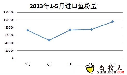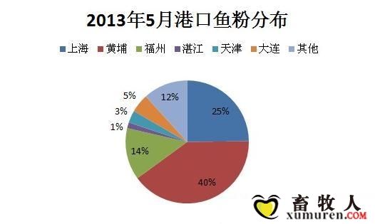 以下將從進(jìn)口總量、分國(guó)別、分港口等進(jìn)行報(bào)告。 圖3-1 2010-2013年1-5月魚(yú)粉進(jìn)口量對(duì)比 2013年1-5月我國(guó)累計(jì)進(jìn)口魚(yú)粉36.5萬(wàn)噸,相比2012年減少了30.5%,大致與2011年持平. 圖3-2 2013年1-5月進(jìn)口魚(yú)粉量 由3-2可以看出上半年2月份魚(yú)粉到港量最低。 圖3-3 2013年1-5月分國(guó)別進(jìn)口魚(yú)粉 盡管秘魯魚(yú)粉出口相比前期有所減少,然而1-5月仍舊有12.2萬(wàn)噸的魚(yú)粉到港,依舊占據(jù)國(guó)內(nèi)第一大魚(yú)粉品種。這樣來(lái)算,秘魯81萬(wàn)噸配額所產(chǎn)的魚(yú)粉應(yīng)該有至少70%出口我國(guó)。另一方面,以美國(guó)、俄羅斯魚(yú)粉為首的雜牌魚(yú)粉進(jìn)口量也明顯增多。 圖3-4 2013年5月魚(yú)粉分布 注:黃埔與廣州港合并