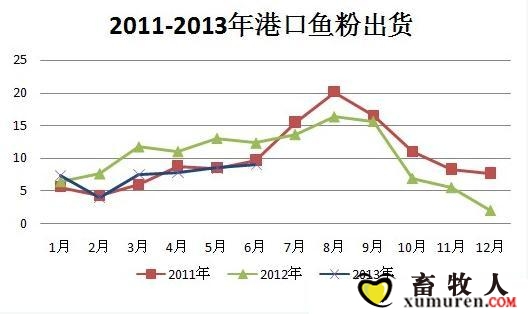 從圖中我們可以看出,2013年港口魚粉出貨大致與2011年持平,同2012年相比差距較大。就港口貿易商反應,今年就在3月份期間有一波出貨小高峰,之后港口魚粉出貨一直比較清淡,進入6月份中下旬之后,魚粉出貨才有所好轉。靜書認為,2013年港口魚粉出貨中,飼料廠港口自提貨物占據一定比例。從圖4-1得出的結論認為,2013年上半年港口魚粉出貨并沒有我們預想的那么差。