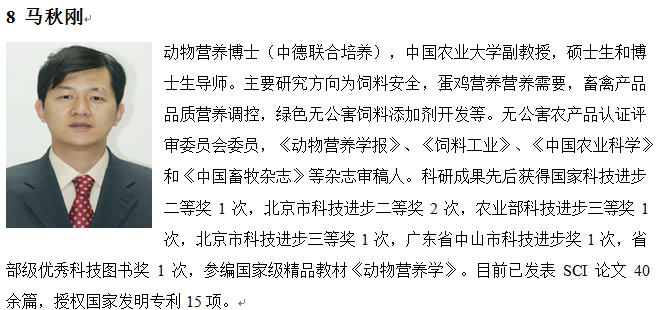 五、大會內容(暫) 六、專家介紹(部分) 七、論文征集: 1、本次研討會將面向全國征集與主題相關的學術報告、論文、調研成果,將擇優選用刊登在會刊(論文集)上作為會議資料,請擬提交論文的人員于2015年7月25日前將論文題目和摘要提交,并將電子版論文全文提交至會議通訊信箱hongs@nferc.org。2、要求論文字數不超過6000字,文件格式為word文檔。具體內容包括:論文題目、作者姓名、工作單位、通訊地址、郵政編碼、電話、論文摘要、關鍵詞、正文、主要參考文獻。 八、收費標準: 本次會議費用定在1200元/人(含報名費、學習費、資料費、餐飲費等),住宿酒店統一安排,費用自理(優惠:5人(含)以上集體報名,可享1000元/人)。 九、聯系方式: 中國飼料霉菌毒素危害與防控論壇-會議秘書處 地址:中國農業大學西校區動物科學技術學院 電話:洪汕(13811101207) 趙麗紅(13426191325) 電郵:hongs@nferc.org 匯款單位:北京龍科方舟生物工程技術有限公司 開戶銀行:中國農業銀行北京分行圓西路支行 帳 號: 11052701040002032