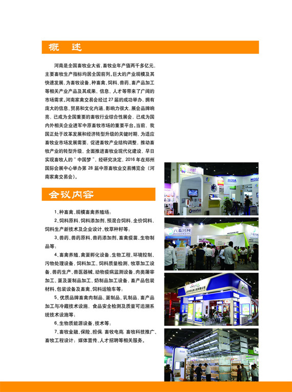 河南省畜牧局 河南省家禽業協會 關于舉辦第二十八屆中原畜牧業交易博覽會 (河南家禽交易會)的通知 豫牧〔2016〕17號 各有關單位: 河南是全國畜牧業大省,畜牧業年產值兩千多億元,主要畜牧生產指標均居全國前列。巨大的產業規模及其快速發展,為畜牧設備、種畜禽、飼料、獸藥、畜產品加工等相關產業產品及其成果、信息、人才等帶來了廣闊的市場需求。河南家禽交易會經過27屆的成功舉辦,擁有龐大的信息、貿易和文化內涵,影響力很大,展會品牌響亮,已成為全國重要的畜牧行業綜合性展會,已成為國內外相關企業進軍中原畜牧市場的重要平臺。當前,我國正處于改革發展和經濟轉型升級的關鍵時期,為適應畜牧業市場發展需要,促進畜牧產業結構調整,推動畜牧產業的轉型升級,全面推進畜牧業現代化建設,早日實現畜牧人的“中國夢”,經研究決定,2016年在鄭州國際會展中心舉辦第28屆中原畜牧業交易博覽會(河南家禽交易會),現將有關事宜通知如下: 一、會議組織 主辦單位:河南省畜牧局 河南省家禽業協會 協辦單位:河南省養豬行業協會 河南省奶業協會 河南省飼料工業協會 河南省動物保健協會 河南省畜牧工程技術協會 河南省畜牧攝影協會 河南省養羊行業協會 二、時間、地點 時間:2016年9月17-18日報到布展,19-21日展覽,會期5天。 展覽地點:鄭州國際會展中心 報到地點:鄭州國際會展中心報到廳 三、會議內容 (一)展覽展示、貿易洽談 1、種畜禽、規模畜禽養殖場; 2、飼料原料、飼料添加劑、預混合飼料、全價飼料、飼料生產新技術、牧草種籽等; 3、獸藥、獸藥原料、獸藥添加劑、畜禽疫苗、生物制品等; 4、畜禽養殖、禽蛋孵化設備,生物工程、環境控制、污物處理設備,飼料加工、飼料質量檢測、牧草加工設備,獸藥生產、獸醫器械、動物疫病監測設備,肉類屠宰加工、蛋及蛋制品加工、奶制品加工設備,畜產品包裝材料、包裝設備及畜禽、飼料運輸車等。 5、優質畜禽肉制品、蛋制品、乳制品,畜產品加工與冷藏技術設施,食品安全檢測及質量可追溯系統技術設施等; 6、生物質能源設備、技術等; 7、畜牧金融、保險、擔保;畜牧電商;畜牧科技推廣、畜牧工程設計;媒體宣傳、人才招聘等相關服務。 (二)交流洽談會、高峰論壇、招商引資、評獎等各類配套活動 組委會組織的主要活動: 中外畜牧企業合作交流洽談會 河南優質畜禽產品產銷對接會 畜牧業投融資機制創新高層論壇 互聯網+畜牧高峰論壇 生態畜牧業發展高峰論壇 禽蛋期貨貿易高峰論壇 禽蛋集約化生產工藝和裝備研討會 第八屆河南種豬拍賣會等 行業領軍企業G10或G20評選頒獎活動 河南省十二五畜牧業發展成就攝影展 企業組織的活動: 重點參展企業聯誼晚會,大型門票抽獎活動及有關企業組織的推介會、客戶培訓會、研討會等。 四、注意事項 1、本屆展會專設大會網站,全部采用線上報名和微信平臺交流。本屆展會不再設立普通標展,全力打造特裝展位和異型簡裝展位,全面提升展會辦展水平。 2、本屆交易會繼續采取主場展會服務商專業服務方式提供會務服務,以提高服務水準。主場展會服務商單位、職責、規定及服務內容另行通知。 3、特別大會宣傳服務:大會邀請全國80余家新聞媒介及報刊(含新媒體)進行大量宣傳報道;積極邀請大量有關人員及單位參會;大會提供各類會議室、多功能報告廳、T型臺、彩虹門、條幅、汽柱、巨型廣告宣傳及廣告制作等服務。 4、會刊(通訊錄)、大會指南企業材料遞交截止日期2016年8月20日,每家參展企業可免費刊登500字內文字廣告。 5、參會參展代表直接與大會聯絡處聯系報名,并索取收費標準、展位圖、展會服務指南等相關資料。 五、大會聯絡處 聯系人:睢富根 薛英霞 段迎珍 地 址:鄭州市經三路89號商務樓2樓 郵 編:450008 單 位:河南省家禽業協會 電子信箱:hnjqxh@163.com 電 話:(037l)65778796 65778798 65778962 65778677 65778657(以上均可傳真) 全國免費電話:4006269626