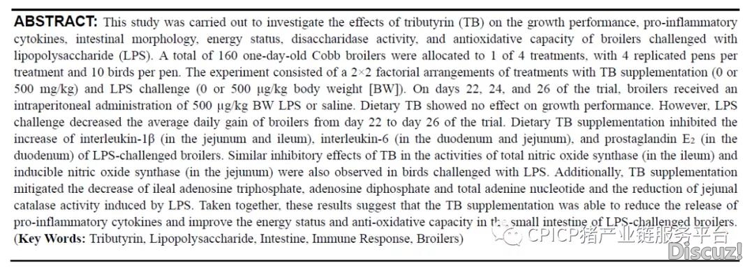 正文摘要:三丁酸甘油酯對受LPS刺激肉雞腸道能量狀態(tài)、抗氧化能力和免疫反應(yīng)的影響 Jiaolong Li, Yongqing Hou等湖北省動物營養(yǎng)與飼料安全合作創(chuàng)新中心武漢輕工大學(xué)湖北省動物營養(yǎng)與飼料科學(xué)重點(diǎn)實(shí)驗(yàn)室 研究的主要目的: ... |